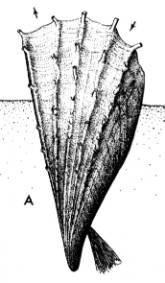 edulis, Anomia simplex, and Ambonychia radiata Look at the jingle shells, Anomia simplex. Only one valve is present, but the other is illustrated on the bookmarked page in the shell guide. The other valve of Anomia has a large byssal opening and is very flat. In fact, the side of an epibyssate bivalve that presses against the hard substrate is often flattened. How is the flattening different in Anomia and Mytilus? What does the flattening accomplish? Endobyssate Bivalves—Pinna and Tridacna Some bivalves sit partially buried in soft sediments and use their byssal threads to anchor themselves to the sediment. These include the delicate pin shell (Pinna) and the giant clam (Tridacna). The pin shell is a “mud sticker;” it lives with the pointy end inserted into the sediment. Can you think of other mud stickers that we’ve seen, in the bivalves or in another group? Pinna, showing