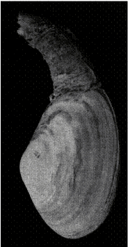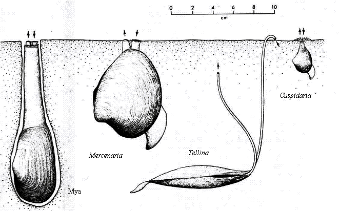 Rapid Burrowers—Ensis Rapid burrowers generally have smooth, elongate, streamlined shells. This razor clam represents the extreme case. How does a smooth shell enhance burrowing speed? Shallow burrowers—Venericardia, Mercenaria campechiensis and Venus (Antigona) Many shallow burrowers have extensive surface ornamentation (ridges, spines, etc.). For the most part, this ornamentation actually slows them down when they burrow. Once they are emplaced in the sediment, these ridges anchor them in place, preventing currents that scour into the sediment from ripping them loose. Often these bivalves also have thick shells. How would a thick shell be useful for these animals (list at least two ideas)? Deep burrowers—Panopea and Lutraria Some bivalves live tens of centimeters below the surface, and some live a meter or more deep. Such animals need very long siphons. If you touch the ends of the siphons at the sediment surface, the animal will quickly retract them downwards. However, the siphons of some species are so long that they cannot fit into the shell, even when fully retracted. The posterior edges of the valves do not come into contact; a gape is left for the extra-long siphons. The posterior gape is often a sign of deep burrowing, as is a deep pallial sinus. The foot is also large, and a gape is often left at the anterior end. Look at the specimens of Panopea, the geoduck (“gooey duck”), and note the anterior and posterior gapes. Why do deep burrowers survive even though their shell does not fully protect their soft parts? Borers A few groups of bivalves bore into wood, rock, or coral, creating a tube-like home. They secrete chemicals to weaken the wood or rock, then use their shell to rasp away the substrate. Their shells seem surprisingly thin given their function. Borers generally have long siphons to reach the end of their hole. Wood borers—Teredo